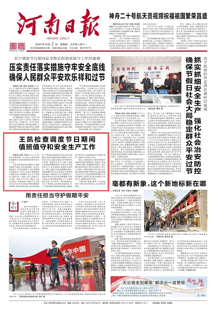 王凱來(lái)到省政府總值班室,視頻連線省氣象局、省交通運(yùn)輸廳、省文化和旅游廳、省自然資源廳、省應(yīng)急管理廳和洛陽(yáng)市、開封市,詳細(xì)了解假期首日道路交通、文旅服務(wù)、安全生產(chǎn)等情況,向堅(jiān)守在一線的工作人員致以節(jié)日問候。他說(shuō),今年“雙節(jié)”疊加,人流車流量大,各地各部門要深入學(xué)習(xí)貫徹習(xí)近平總書記在河南考察時(shí)重要講話精神,樹牢底線思維,強(qiáng)化風(fēng)險(xiǎn)意識(shí),嚴(yán)格落實(shí)值班值守和信息報(bào)送等制度,加強(qiáng)會(huì)商研判和協(xié)調(diào)聯(lián)動(dòng),用辛勤付出為人民群眾創(chuàng)造平安祥和的節(jié)日環(huán)境。要密切關(guān)注天氣變化,提高氣象預(yù)報(bào)預(yù)警精準(zhǔn)度,有效應(yīng)對(duì)持續(xù)降雨天氣,切實(shí)加強(qiáng)山洪地質(zhì)災(zāi)害防范。要扎實(shí)做好交通運(yùn)輸服務(wù)保障,加強(qiáng)高峰時(shí)段、熱點(diǎn)線路運(yùn)力調(diào)配和管控疏導(dǎo),確保群眾安全便捷出行。要更好激發(fā)文旅市場(chǎng)消費(fèi)潛能,持續(xù)豐富業(yè)態(tài),提升服務(wù)質(zhì)量,讓廣大游客乘興而來(lái)、盡興而歸。要嚴(yán)格落實(shí)安全生產(chǎn)責(zé)任制,及時(shí)排查消除?;?、礦山、消防等重點(diǎn)領(lǐng)域風(fēng)險(xiǎn)隱患,加強(qiáng)商超、景區(qū)等人員密集場(chǎng)所安全監(jiān)管,維護(hù)人民群眾生命財(cái)產(chǎn)安全。