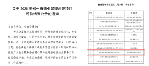 近日,鄭州市物業(yè)管理協(xié)會官網(wǎng)發(fā)布《關(guān)于2025年鄭州市物業(yè)管理示范項目評價結(jié)果公示的通知》,城發(fā)·金岱智慧產(chǎn)業(yè)園獲評“鄭州市物業(yè)管理示范項目”。